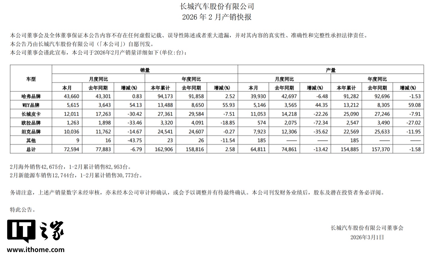 IT之家 3 月 1 日消息,长城汽车股份有限公司刚刚发布了最新的 2026 年 2 月产销快报。