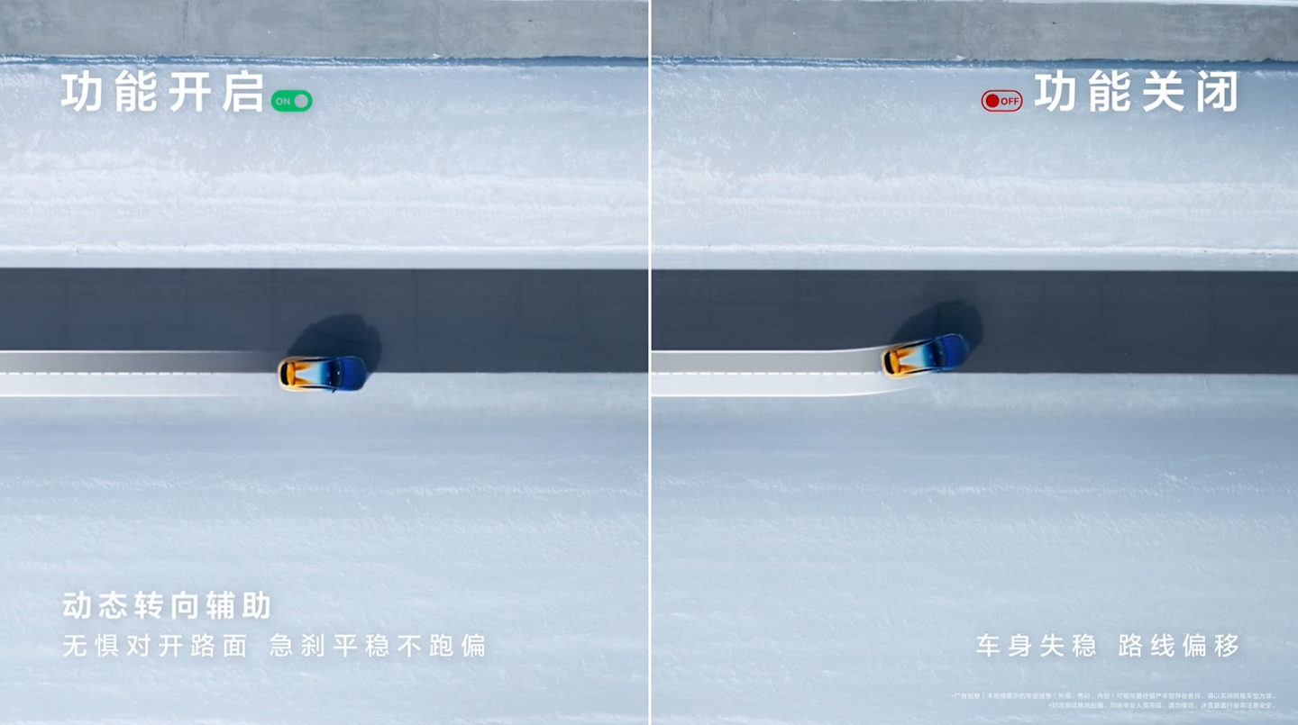 在开启「动态转向辅助」后,该车面对沥青 + 冰雪混合对开路面(沥青附着系数≈0.7、冰面附着系数≈0.1),可实现急刹平稳不跑偏的效果,同时还支持稳定高速连续变道。