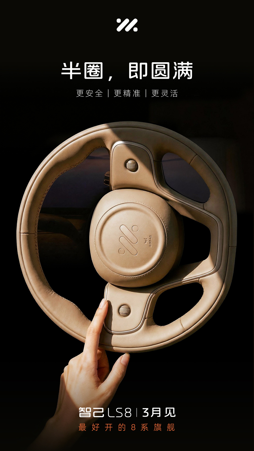 IT之家 3 月 3 日消息,今晚智己汽车放出了一张旗下全新大型 SUV 智己 LS8 的预告图,预告图展示了新车的方向盘,“半圈,即圆满”暗示新车将采用线控转向技术,方向盘与转向机之间没有机械连接,转向比优化,打半圈即可完成传统方向盘一圈的转向幅度。同时海报还确认,新车将于 3 月发布。