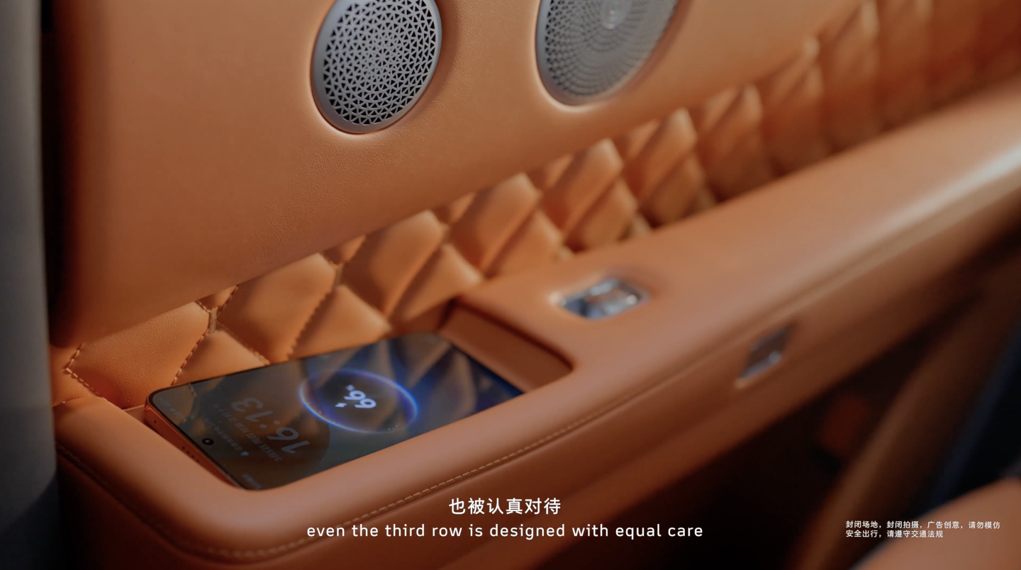 参考官方海报,该车采用 2+2+2 式 6 座布局,内饰使用橙红色 / 灰色的双拼配色设计,前排提供双辐方向盘、悬浮液晶仪表、大尺寸双联屏、怀挡式换挡设计。二排空间带有吸顶娱乐屏、带腿托的零重力座椅,门边的把手位置留有手机无线充电区域。