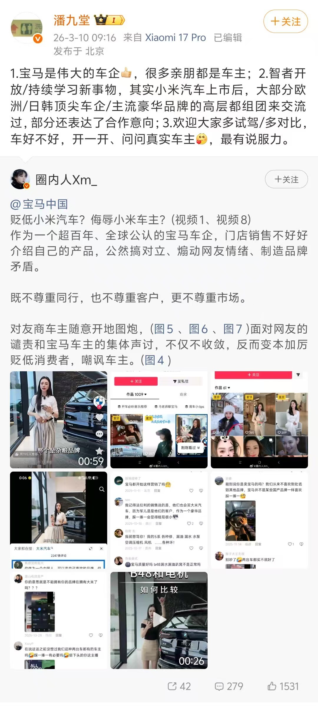 凤凰网科技讯 3月10日,小米产业投资部合伙人潘九堂发文回应“宝马销售直播狂踩小米汽车”事件。他表示,小米汽车上市后,大部分欧洲/日韩顶尖车企/主流豪华品牌的高层都组团来交流过,部分还表达了合作意向;欢迎大家多试驾/多对比,车好不好,开一开、问问真实车主,最有说服力。