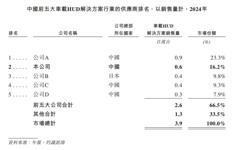 2024年,中国车载HUD解决方案市场中,前五大供应商合计占据市场份额的66.5%,其中只有四家都为中国厂商。
