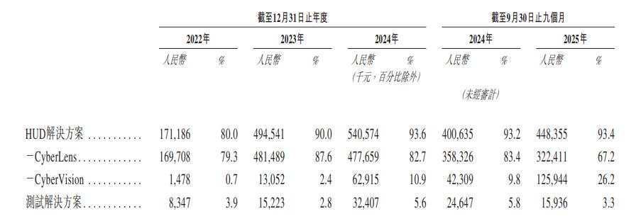 在泽景科技的HUD产品中,又是CyberLens占据收入大头,但占比已开始呈现下滑趋势,而CyberVision则正在飞速攀升,其比重已经从2022年的0.7%,跃升到了2025年9月末的26.2%。