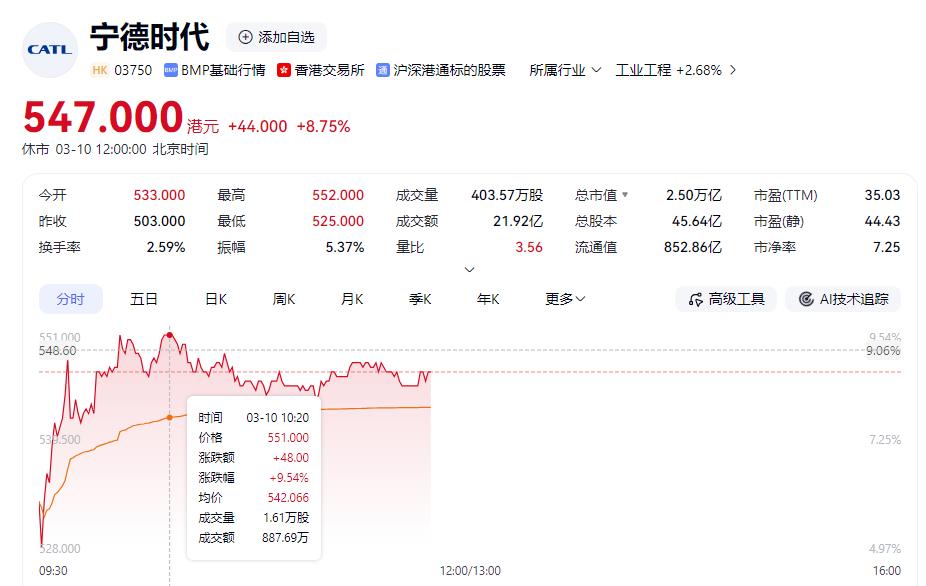截至发稿前,宁德时代A股股价最高涨超6%,港股股价一度涨超9%。