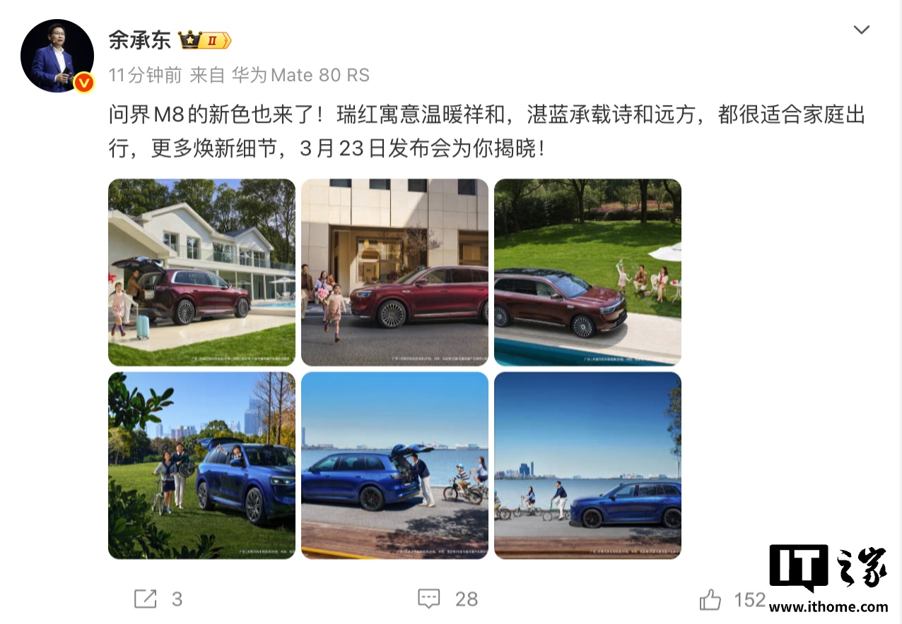 IT之家 3 月 16 日消息,今天下午,华为常务董事、产品投资委员会主任、终端 BG 董事长余承东通过官微宣布:问界 M8 的新色也来了!其中,“瑞红”寓意温暖祥和,“湛蓝”承载诗和远方,两款车色均适用于“家庭出行”,更多焕新细节将在 3 月 23 日发布会揭晓。