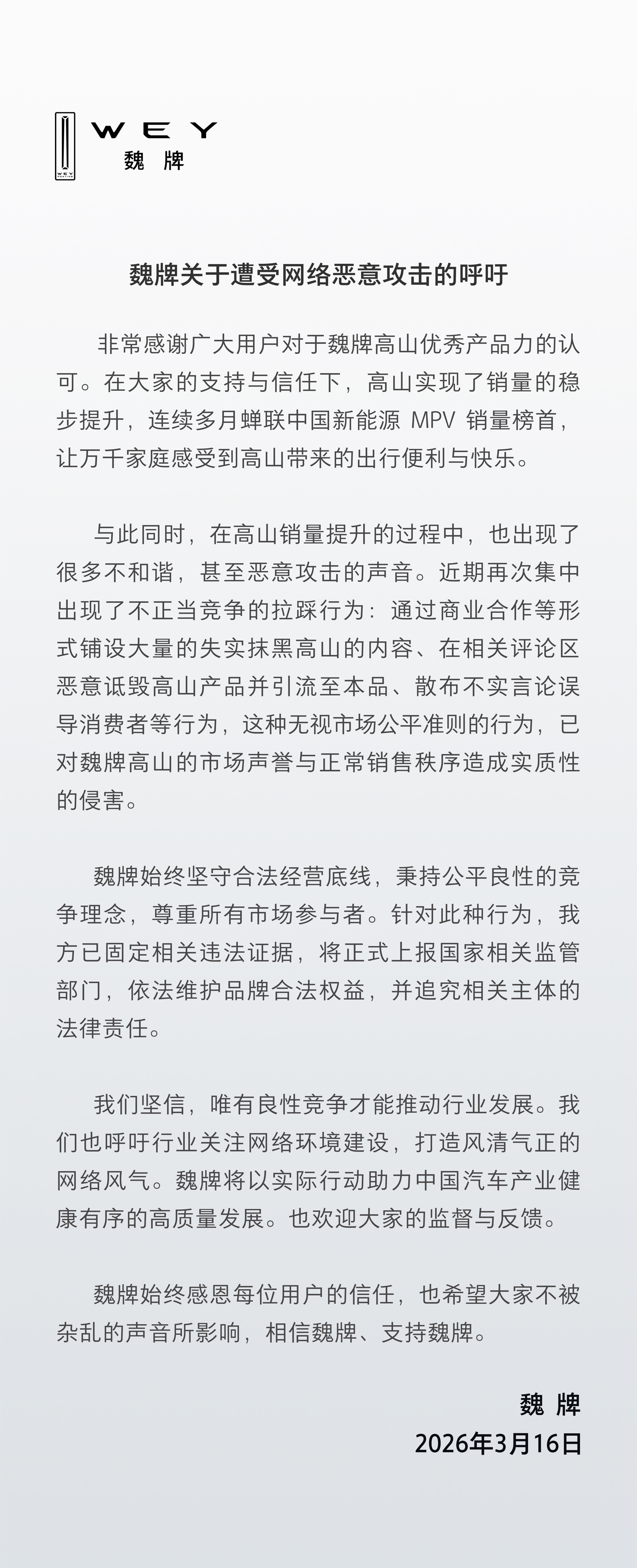 IT之家 3 月 16 日消息,长城汽车魏牌官方微博今日发布了关于遭受网络恶意攻击的呼吁,称在高山 MPV 销量提升的过程中,出现了很多不和谐,甚至恶意攻击的声音,近期再次集中出现了不正当竞争的拉踩行为。