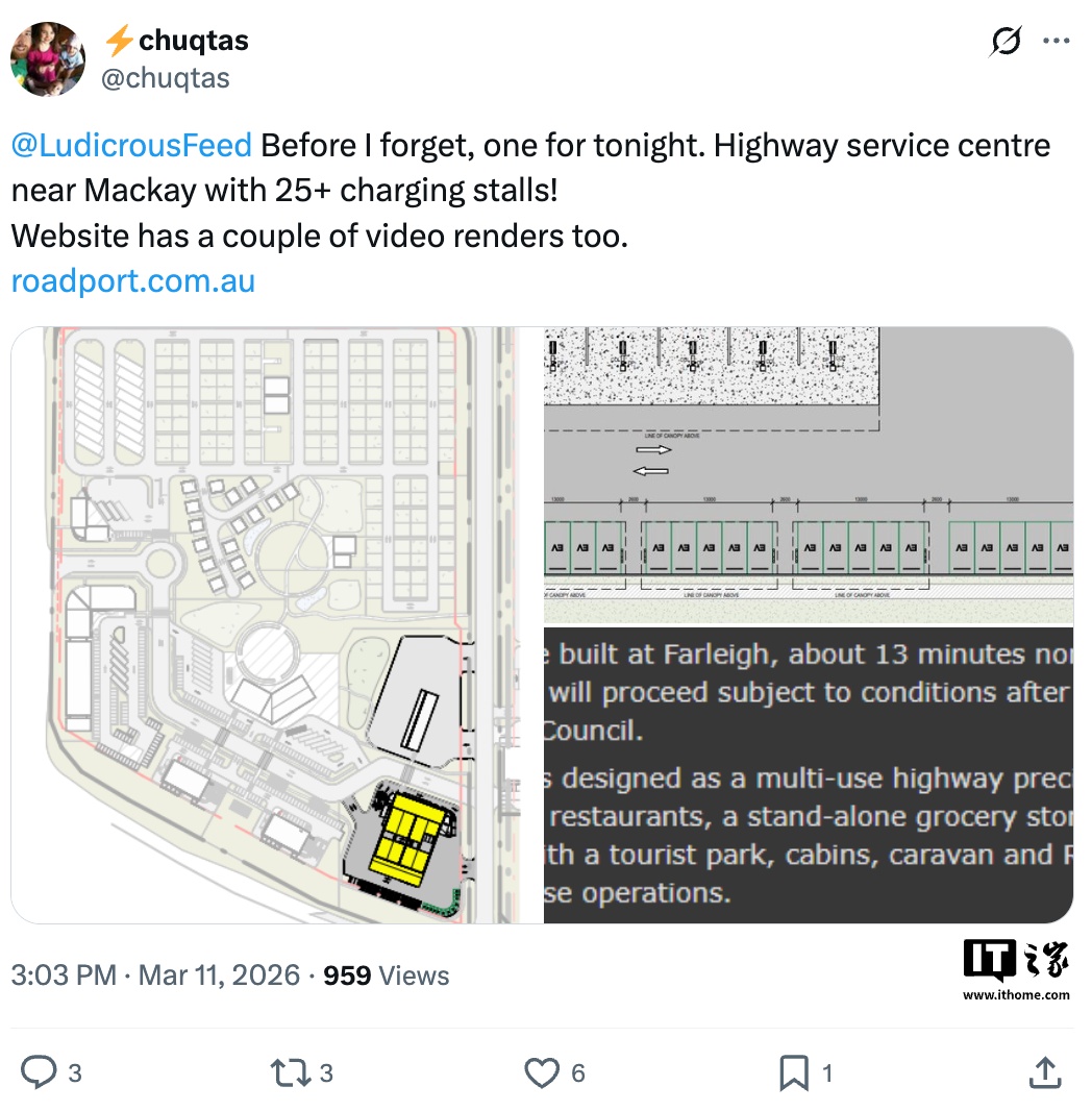 IT之家 3 月 17 日消息,据外媒 Teslarati 报道,特斯拉正计划在澳洲兴建一座大型超级充电站,该充电站竣工后将超过目前位于新南威尔士州的 Goulburn 充电站(提供 20 个充电车位),成为特斯拉在澳洲的最大充电站。