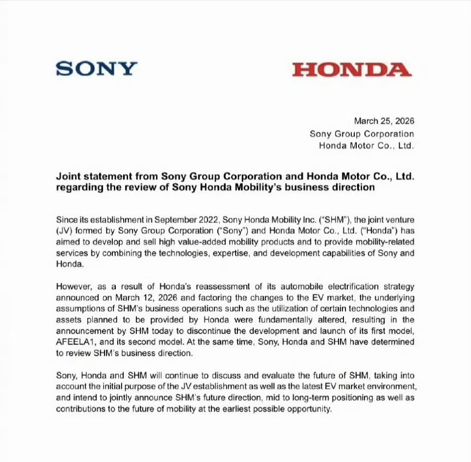 3月25日,索尼与本田发布联合声明,宣布彻底终止Afeela系列电动汽车的研发与上市计划,首款量产车Afeela 1及第二款研发车型均被叫停。据悉,Afeela 1此前已启动试生产,原计划2026年年中在日本和美国加州交付,且已开放200美元预订,如今合资公司将全额退还订金。