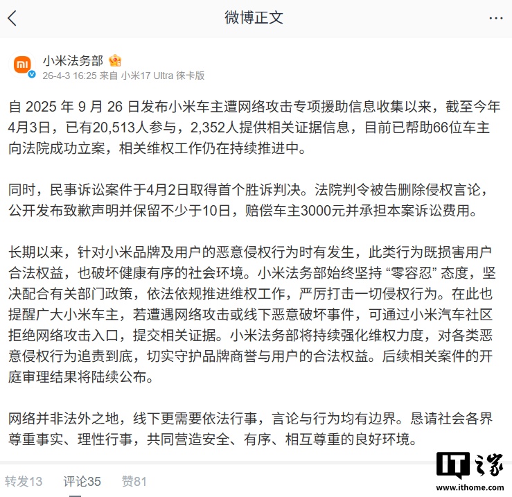 自 2025 年 9 月 26 日发布小米车主遭网络攻击专项援助信息收集以来,截至今年 4 月 3 日,已有 20,513 人参与,2,352 人提供相关证据信息,目前已帮助 66 位车主向法院成功立案,相关维权工作仍在持续推进中。