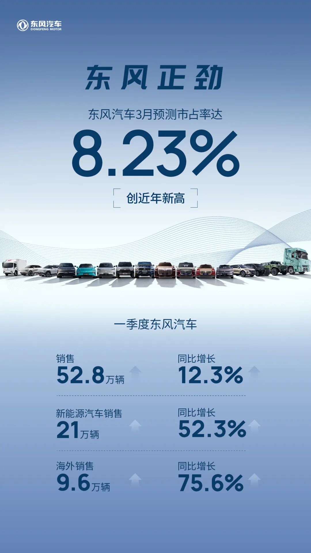 IT之家 4 月 5 日消息,4 月 3 日晚,东风汽车公布了今年 3 月及今年第一季度的销量情况。当月,东风汽车预测市占率达 8.23% 创近年新高(IT之家注:暂未公布具体销量及同环比情况)。今年第一季度,东风汽车销量 52.8 万辆,同比增长 12.3%;新能源汽车销量 21 万辆,同比增长 52.3%;海外销量 9.6 万辆,同比增长 75.6%。