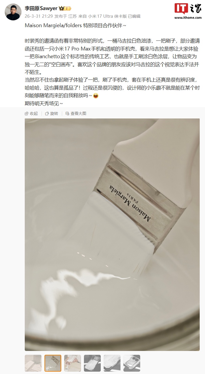 小米汽车工业设计总经理、首席设计师李田原在今年 3 月底曾透露过小米和 Maison Margiela / folders 的特别项目合作,并晒出了小米 17 Pro Max 的定制设计壳。