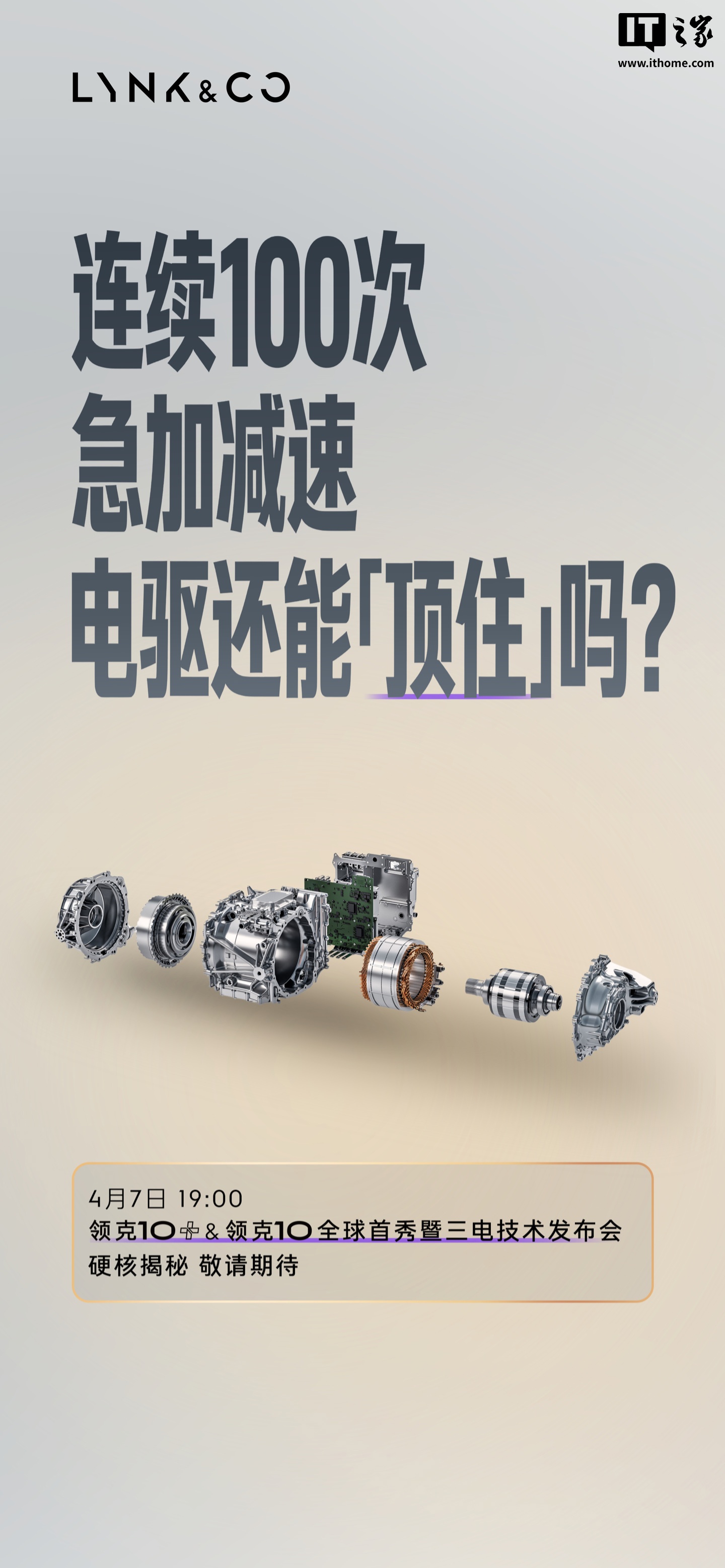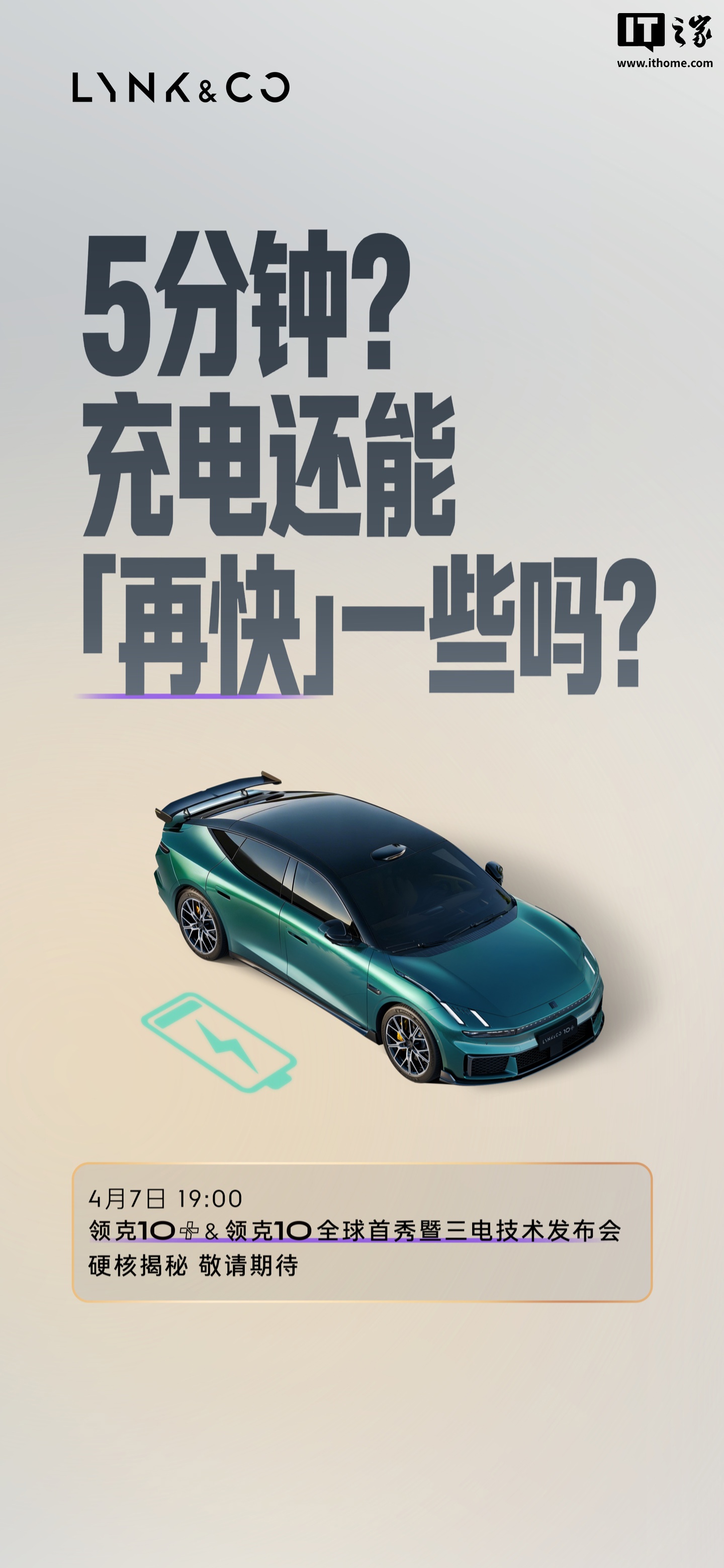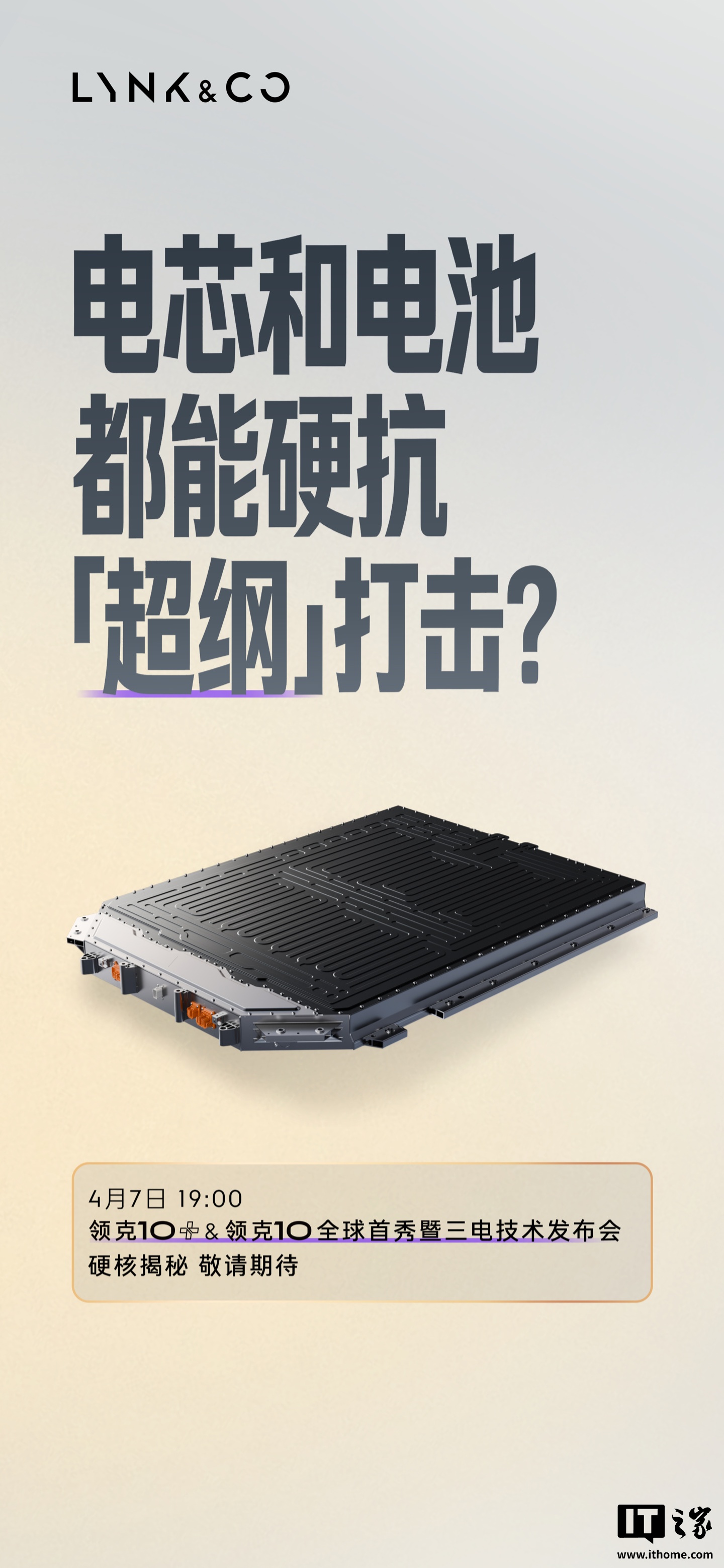 IT之家 4 月 6 日消息,领克汽车官方今日宣布,领克 10+ & 领克 10 全球首秀暨三电技术发布会定档 4 月 7 日 19:00 举行,将解答电芯和电池能否硬扛「超纲」打击、连续 100 次急加减速电驱能否「顶住」、充电能否再快一些等问题。