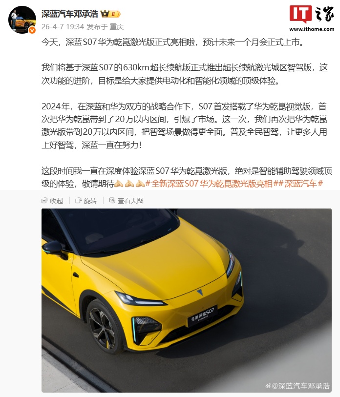 IT之家注意到,深蓝汽车董事长邓承浩刚刚发文透露,深蓝 S07 华为乾崑激光版预计未来一个月会正式上市。