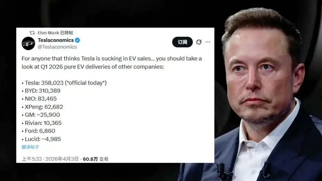 有意思的是,当市场开始用这些数据判断特斯拉“走弱”时,马斯克表示不服气,在X上转发了一组数据,对比了2026年一季度主要纯电车企的交付情况。
