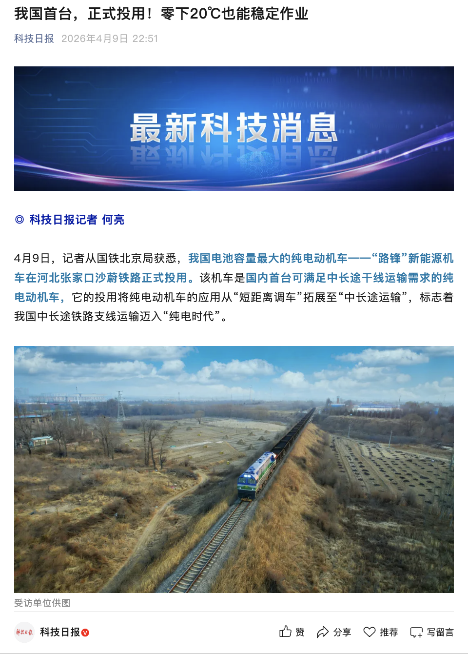 IT之家 4 月 10 日消息,据《科技日报》4 月 9 日报道,我国电池容量最大的纯电动机车 ——“路锋”新能源机车在河北张家口沙蔚铁路正式投用。该机车是国内首台可满足中长途干线运输需求的纯电动机车,它的投用将纯电动机车的应用从“短距离调车”拓展至“中长途运输”,标志着我国中长途铁路支线运输迈入“纯电时代”。