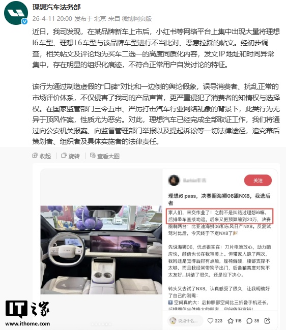 IT之家 4 月 11 日消息,理想汽车法务部今晚发布声明称,近日在某品牌新车上市后,小红书等网络平台上集中出现大量将理想 i6 车型、理想 L6 车型与该品牌车型进行不当比对、恶意拉踩的帖文。