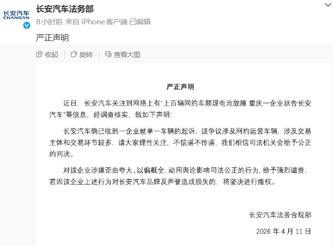 4月11日,长安汽车法务部发布官方声明,回应近日网络流传的“上百辆网约车频现电池故障,重庆一企业状告长安汽车”等消息。长安汽车确认,确实收到了一家企业就单一车辆提起的诉讼。该案涉及网约运营车辆,交易主体与环节较为复杂。长安汽车在声明中呼吁公众理性关注,“不信谣、不传谣”,并相信司法机关会作出公正判决。