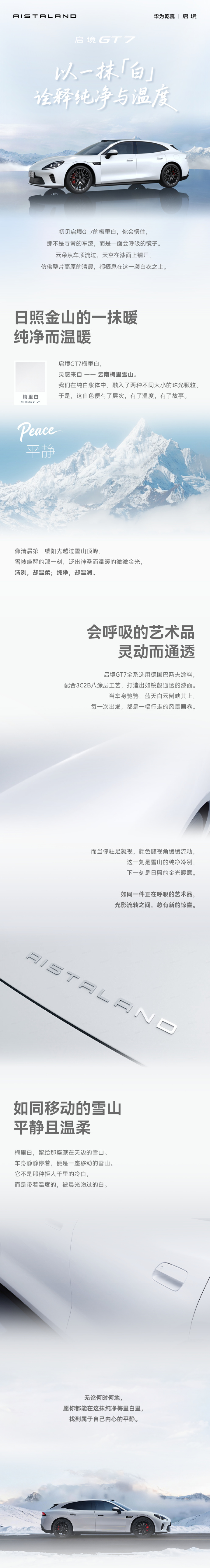 IT之家 4 月 12 日消息,启境汽车今日公布启境 GT7“梅里白”车色官图,号称“全系选用德国巴斯夫涂料,配合 3C2B 八涂层工艺,打造出如镜般通透的漆面。”