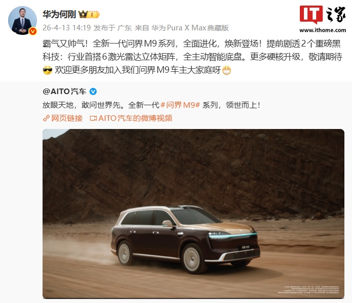 IT之家注意到,华为常务董事、产品投资评审委员会主任、终端 BG 董事长余承东今日放出预告,宣布全新一代问界 M9 系列将搭载更强大的华为全栈黑科技。