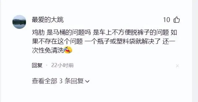 正如有网友说,其实关键的问题不是马桶的问题,而是车上不方便脱裤子的问题。“就算不是当着朋友,当着家人脱裤子拉,也是挺尴尬的。”