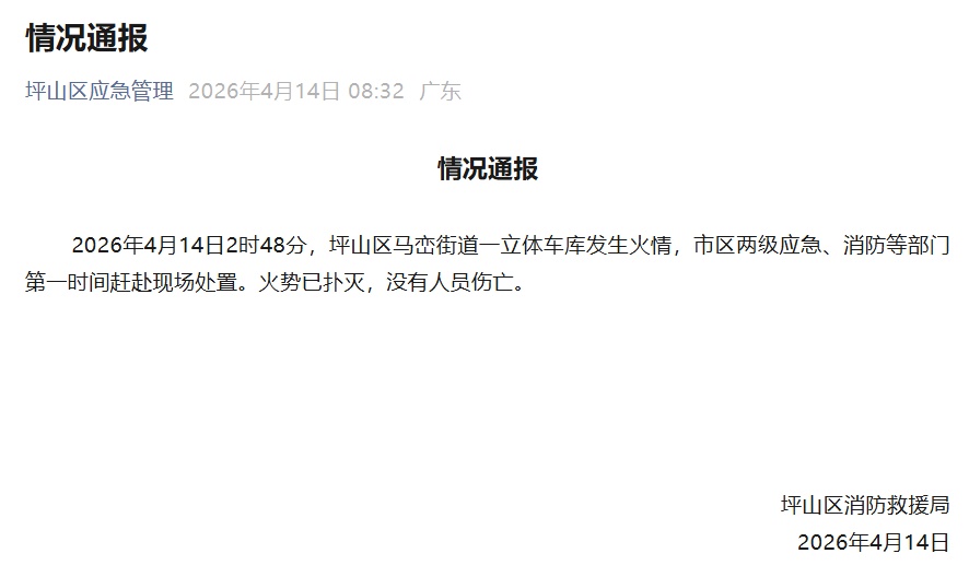 2026 年 4 月 14 日 2 时 48 分,坪山区马峦街道一立体车库发生火情,市区两级应急、消防等部门第一时间赶赴现场处置。火势已扑灭,没有人员伤亡。