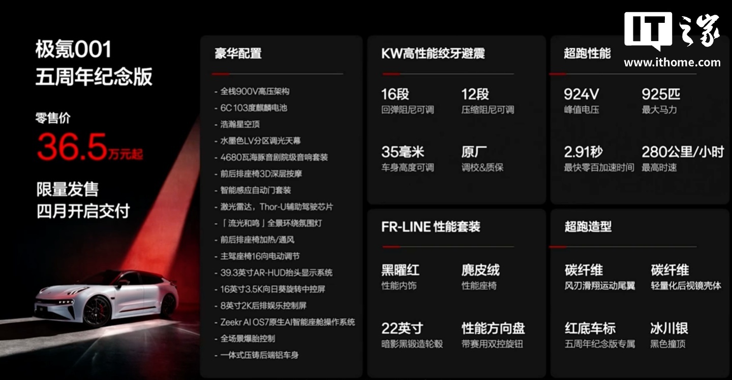 IT之家 4 月 14 日消息,极氪官方今日消息,极氪 001 五周年纪念版首批已全部售罄。新车于 4 月 10 日正式上市,上市价格为 36.5 万元起。