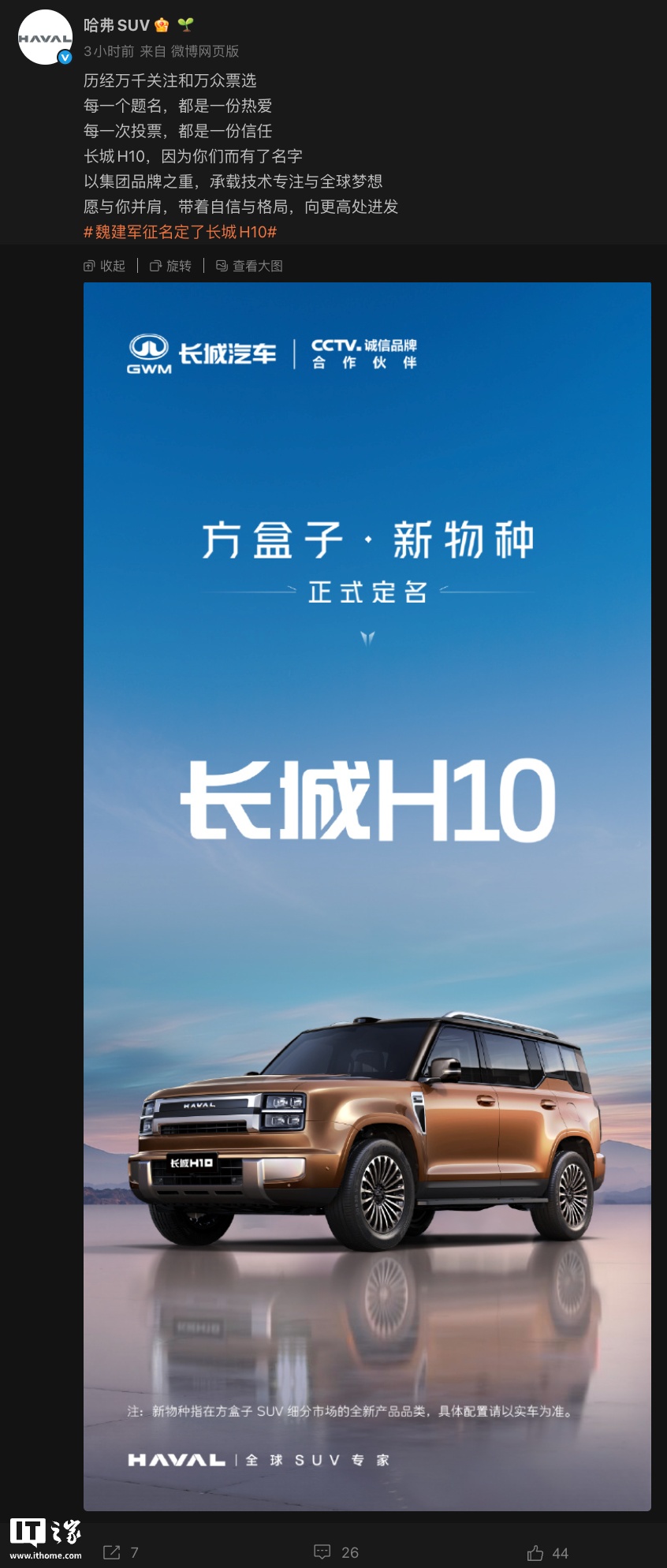 IT之家 4 月 15 日消息,哈弗汽车在微博发文,宣布旗下归元平台全新旗舰 SUV 正式定名长城 H10,官方表示,新车以集团品牌之重,承载技术专注与全球梦想。