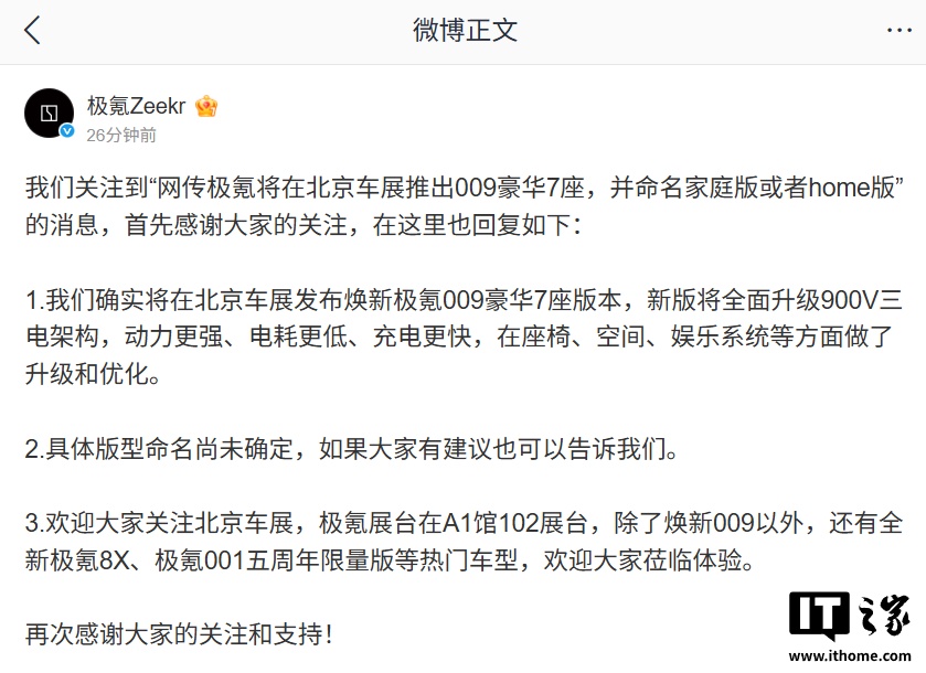 IT之家 4 月 21 日消息,极氪官方今日发文称,关注到“网传极氪将在北京车展推出 009 豪华 7 座,并命名家庭版或者 home 版”的消息,并进行回复: