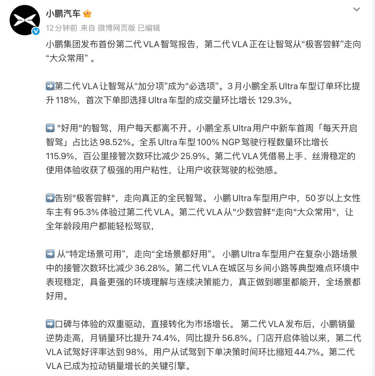 销量层面,第二代VLA发布后,小鹏月销量环比提升74.4%,同比提升56.8%。门店试驾好评率为98%,用户从试驾到下单决策时间环比缩短44.7%。
