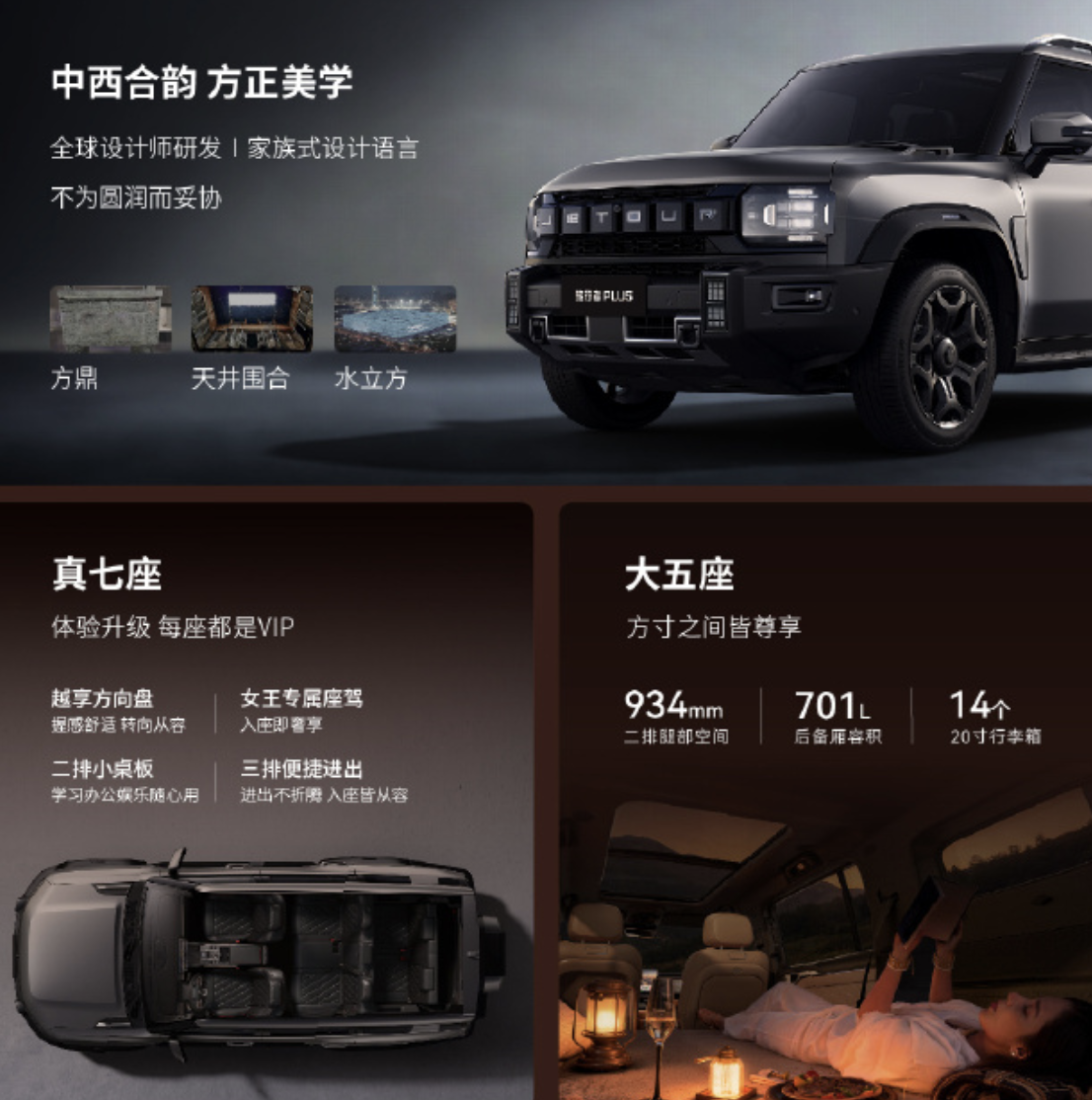 捷途旅行者 PLUS 系列车型延续“方盒子”设计,前脸配备了 JETOUR 立体格栅及纵横矩阵式前灯;车身采用传统造型门把手;车顶配备 64 英寸全景大天窗;车尾提供直瀑贯穿式尾灯,同时采用魔术电吸尾门,配有“小书包”设计。