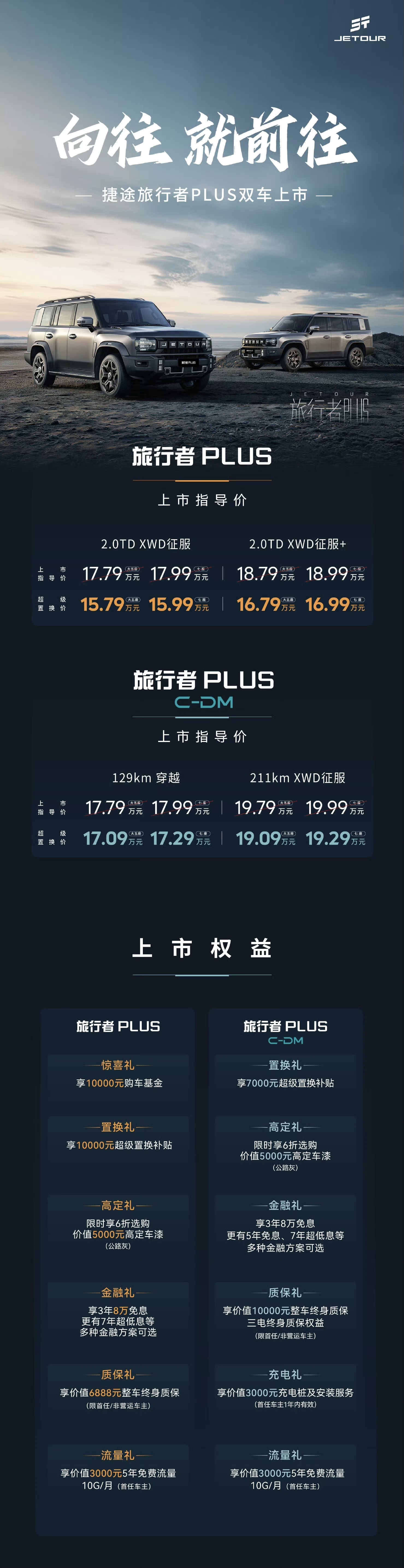 IT之家 4 月 24 日消息,奇瑞捷途旅行者 PLUS 双车今日正式上市,超级置换价 15.79 万元起。