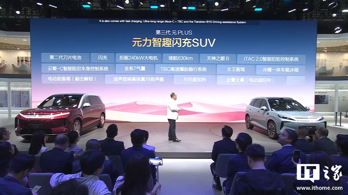 IT之家 4 月 24 日消息,在今日的发布会上,比亚迪第三代元 PLUS 正式亮相(IT之家注:并非上市或预售),外观和内饰设计焕新。