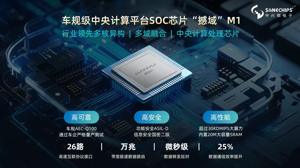 “撼域”M1是广汽研究院与中兴微电子联合研发的车规级高性能中央计算平台SoC芯片,也是广汽 CCU中央运算单元中技术复杂度最高、集成度最强的核心部件。芯片具备大算力、高带宽、大存储、高安全四大优势,采用多核异构架构,搭载自研网络加速引擎实现三网高效互转,实时域性能较国际同类产品提升25%,可高效支撑海量并发任务处理,实现车身、底盘、动力域深度协同与精准控制。
