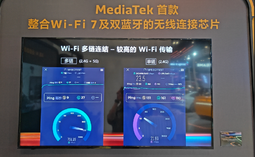 而车载联接方案的演示中,基于 5G-Advanced、3GPP NR NTN 卫星通信、Wi-Fi 7 技术打造的平台,即便在模拟的地面网络盲区场景中,也能完成稳定的卫星视频通话,实现了全场景的持续在线。并且,联发科现场透露,Wi-Fi 8 车载通信平台也将于年内上车。
