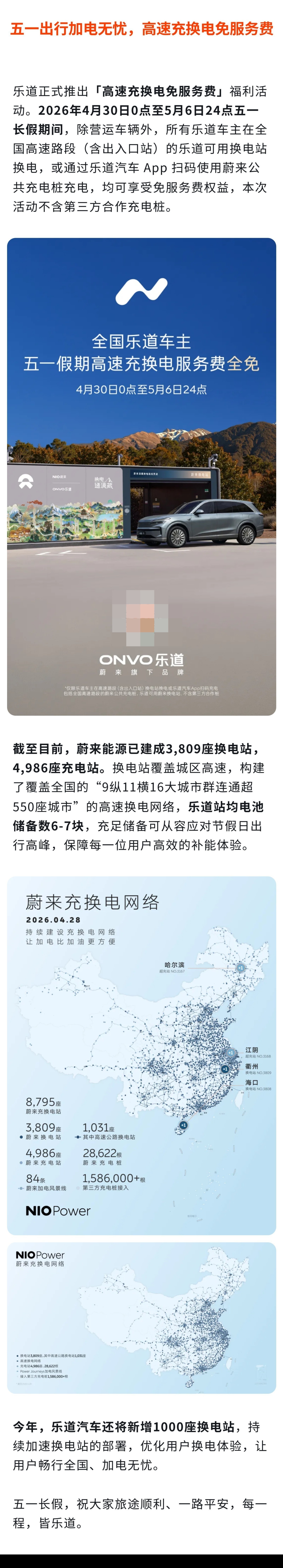 凤凰网科技讯 4月28日,乐道汽车宣布正式推出“高速充换电免服务费”福利活动。2026年4月30日0点至5月6日24点,除营运车辆外,所有乐道车主在高速路段(含出入口站)换电站换电,或通过乐道汽车App扫码充电,可享免服务费权益。