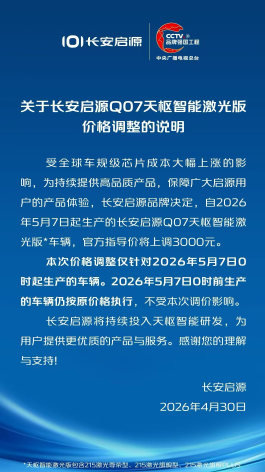 快科技4月30日消息,长安启源官方发布调价公告,受全球车规级芯片成本大幅上涨影响,自2026 年5月7日0时起生产的启源Q07天枢智能激光版车型,官方指导价统一上调3000 元,5月7日前生产的车辆仍按原价执行,不受此次调价影响。