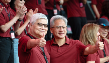 黄仁勋身着红色短袖现身台积电运动会 与魏哲家竖大拇指合影