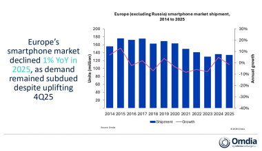Omdia:欧洲智能手机市场 2025 年出货下降 1%,荣耀首次跻身市占前五