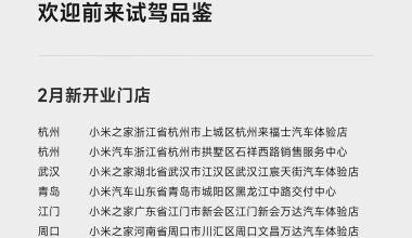 小米汽车:2月新增6家门店,全国141城已有488家门店