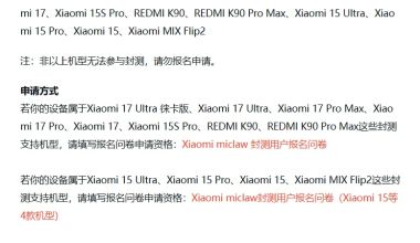 小米官方“龙虾”Xiaomi miclaw封测新增15 Ultra等4款机型