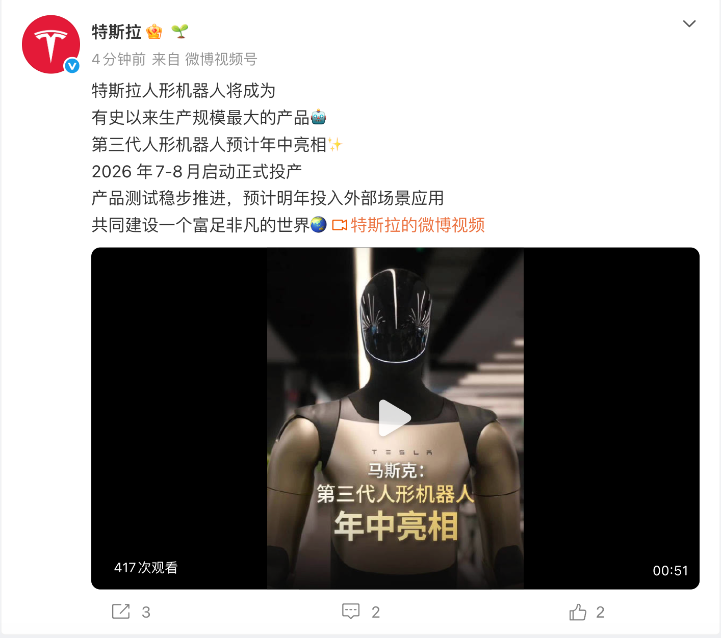 特斯拉:第三代人形机器人预计年中亮相 2026年7-8月启动正式投产