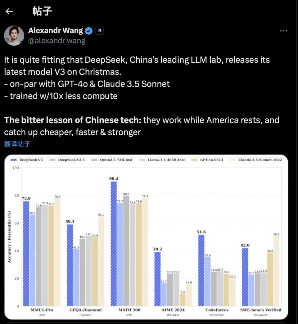 Scale AI创始人亚历山大·王 (Alexander Wang)更表示,DeepSeek-V3带来的辛酸教训是:当美国休息时,中国在工作,以更低的成本、更快的速度迎头赶上,变得更强。