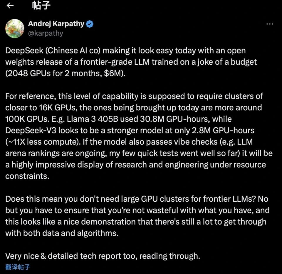 OpenAI早期成员安德烈·卡帕西(Andrej Karpathy)就表示DeepSeek-V3的出现也许意味着不需要大型GPU集群来训练前沿的大语言模型。它表明大模型在数据和算法方面仍有很大的提升空间。