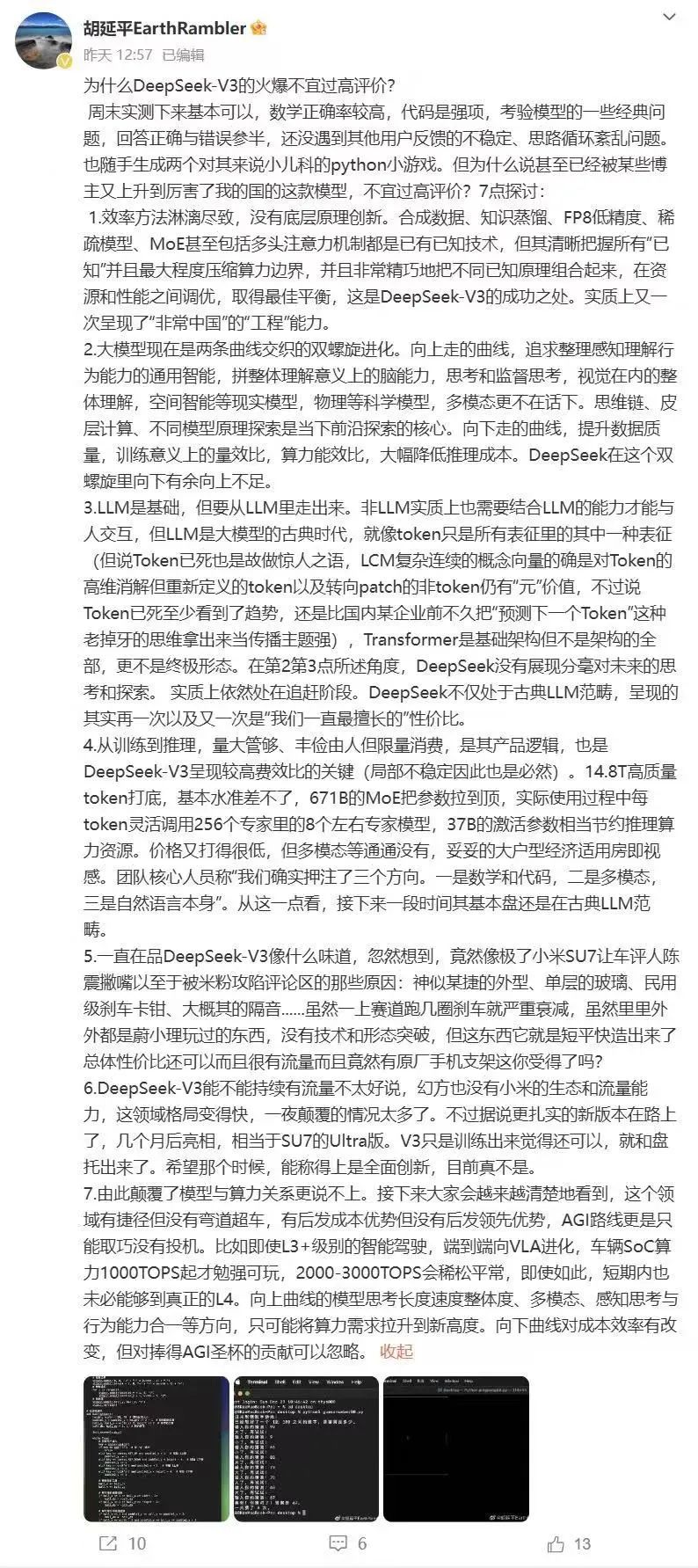 他发微博表示,当前大模型发展面临双螺旋式的演化。一条是向上攀升的性能曲线,追求更深层的理解和推理能力;另一条是向下延伸的基础曲线,着重提升效率和落地能力。DeepSeek-V3在这个维度上似乎仍未完全突破天花板。