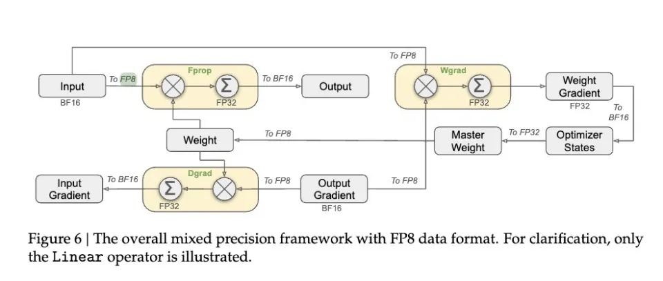 在模型训练中,大部分的前向运算都使用FP8来处理,这样可以大大节省显存和计算资源,让整个训练过程跑得更快。但他们也很清楚哪些地方不能省:比如最后的调味、摆盘(对应嵌入模块、输出头等),就一定要用精密的工具(FP16或FP32精度)。
