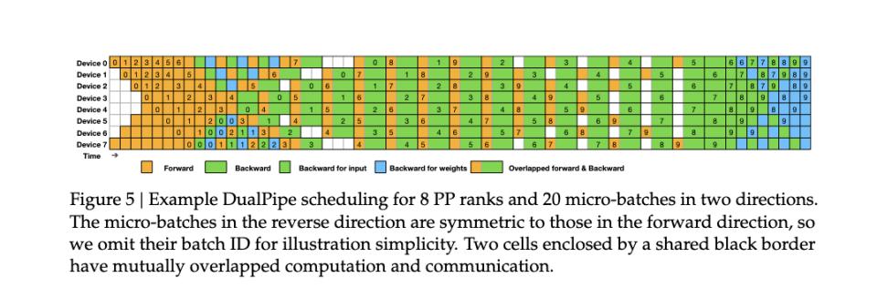 (DualPipe示意图,在图中由共享黑色边框包围的两个单元格具有相互重叠的计算和通信。)