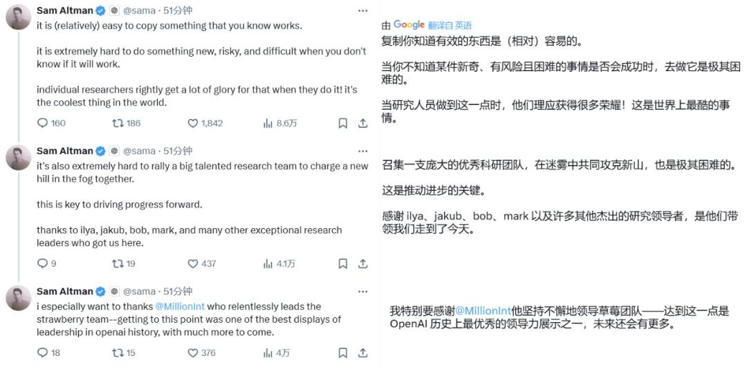 之后,他又单独发了一条推文对一位「爱因斯坦级别的天才」表达了特别感谢:Alec Radford。奥特曼还表示 Radford 是他一直以来最喜欢的人,并指出 AI 领域当今的进步很多都可以追溯到他的研究成果。上个月 20 号,传出了 Radford 即将离开 OpenAI 进行独立研究的消息,详情可参阅机器之心的报道《刚刚,OpenAI 元老级研究员 Alec Radford 离职,他主导了 GPT-1、GPT-2 的研发》。