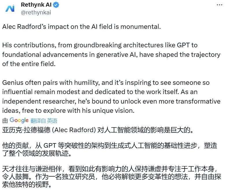 2024 年年末,在 OpenAI 赚尽眼球的 12 天连发的最后一天前,Alec Radford 即将离开 OpenAI 的消息传出,但没有任何消息透露这是否与 OpenAI 的组织结构调整有关。
