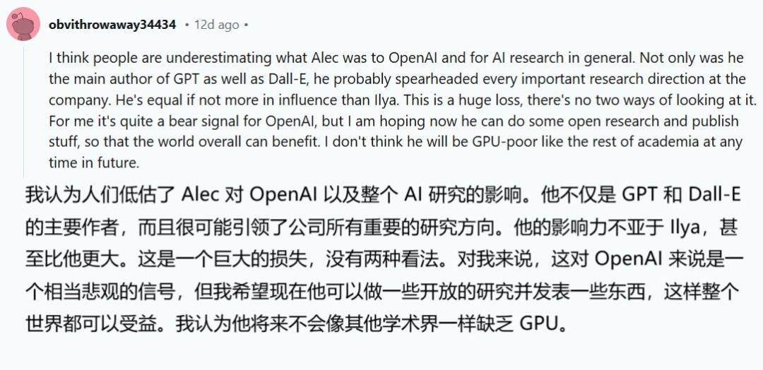 他的第一个实验是使用 20 亿条 Reddit 评论来训练语言模型,虽然失败,但 OpenAI 给予了足够的试错空间,也成为后续一系列革命性突破的开始,如大家熟知的初代 GPT,还主导了 GPT-2 的研发等。