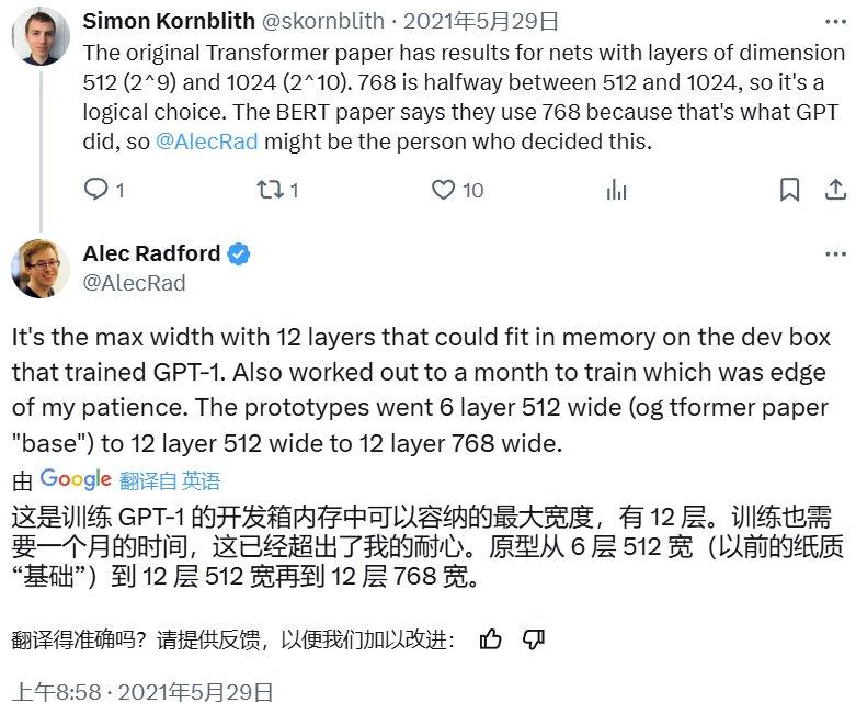 他也曾活跃在 X/Twitter 上,在那里分享他对人工智能各个领域的见解和观点。遗憾的是,2021 年 5 月之后他就再未在 X 上现身,最后一条推文是在回复 Anthropic 的研究者 Simon Kornblith,解释 GPT-1 层宽度设置为 768 的原因。